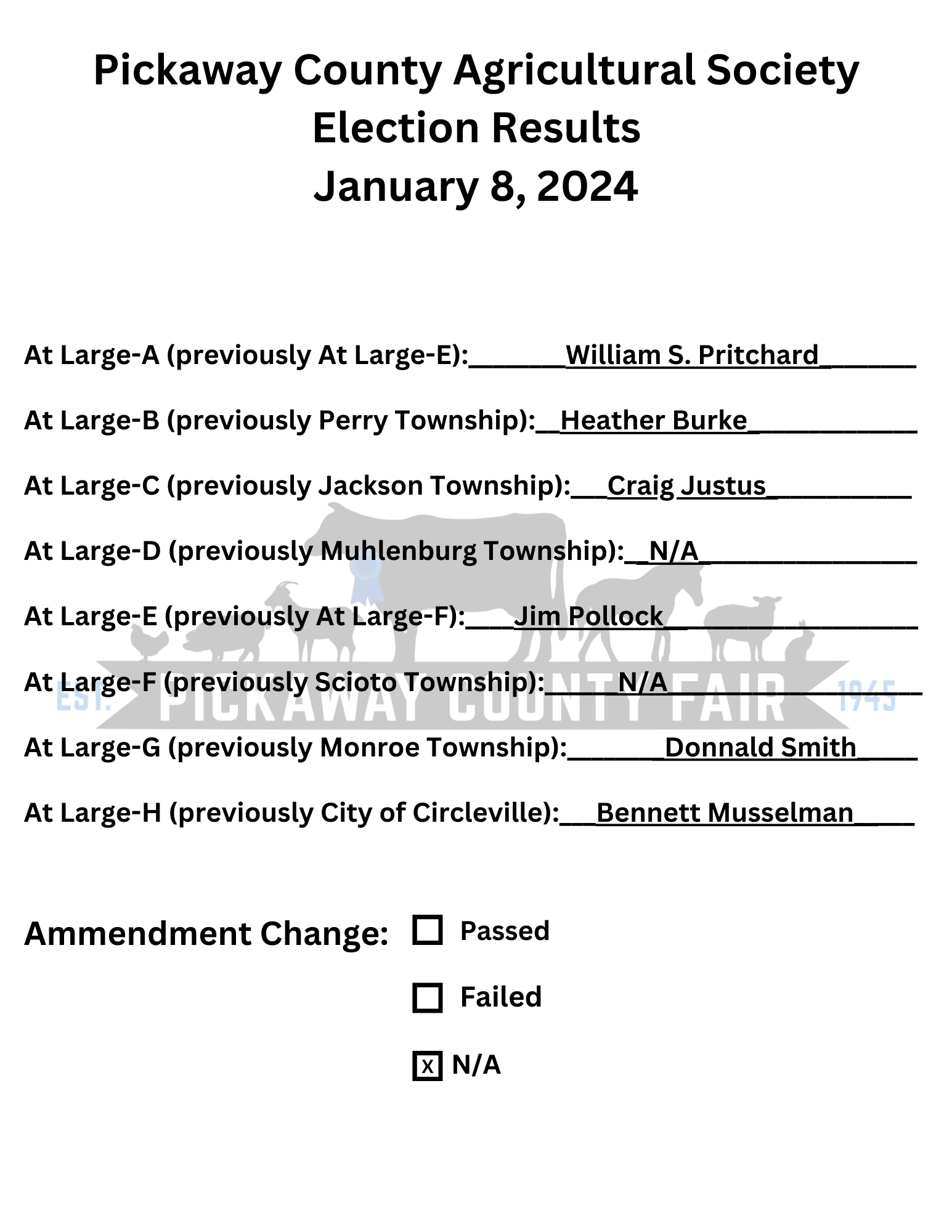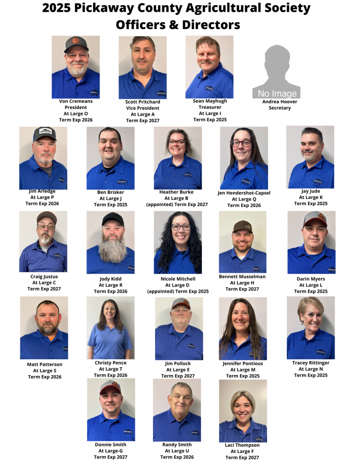 The Senior Fair Board is the governing body of the Pickaway County Agricultural Society and Pickaway County Fair. PCAS partners in collaboration with Junior Fair Board, and Livestock & Sale Committee. The Senior Fair Board manages, maintains and up keeps the Pickaway Agriculture and Event Center, and makes decisions on events for the fair and other events that take place on the property.